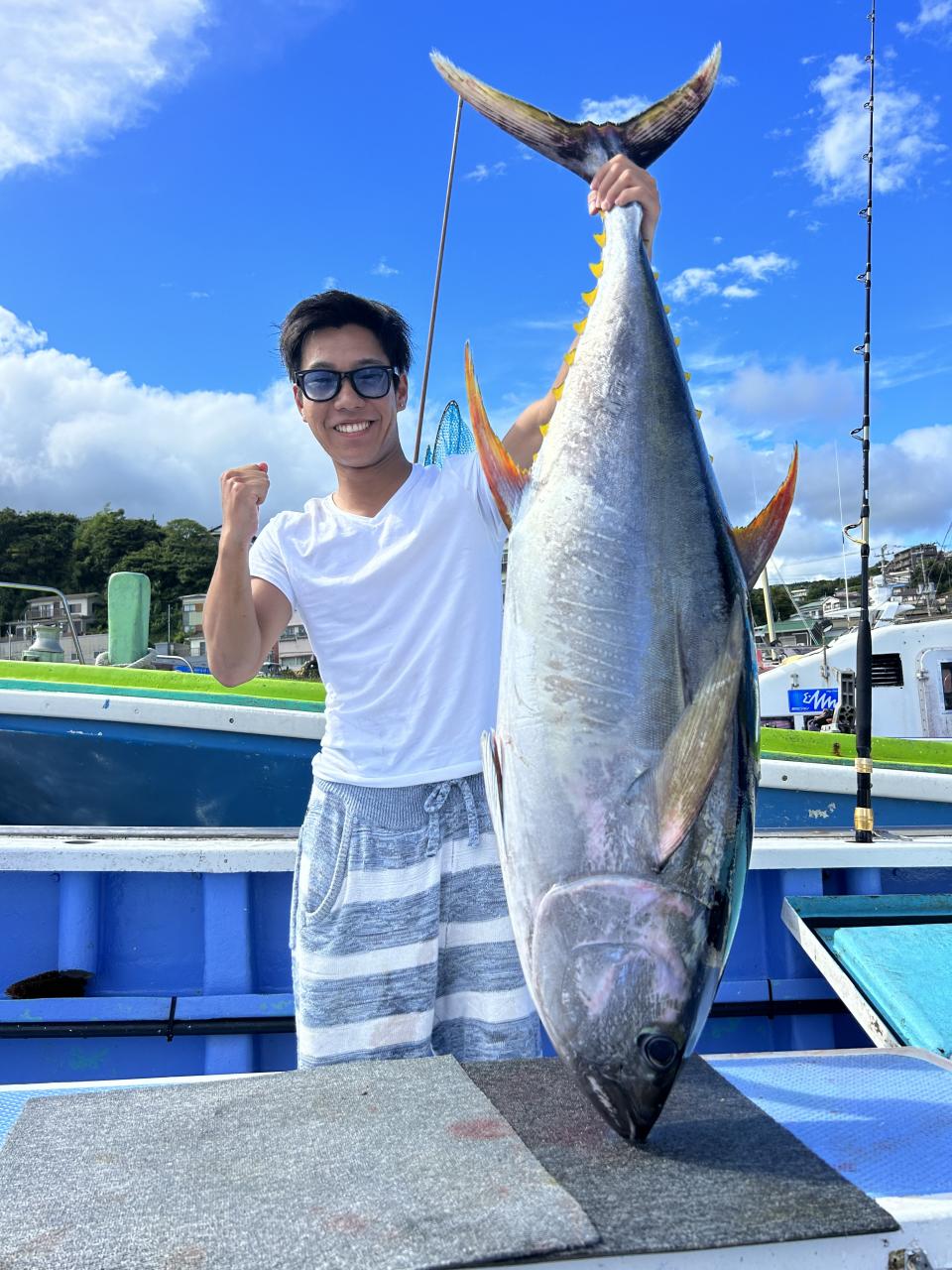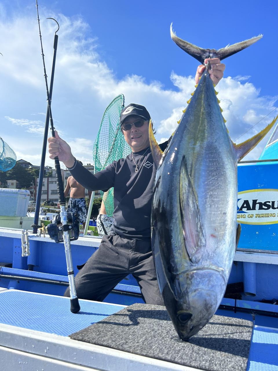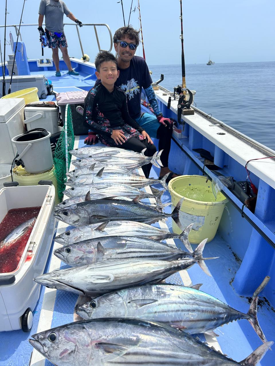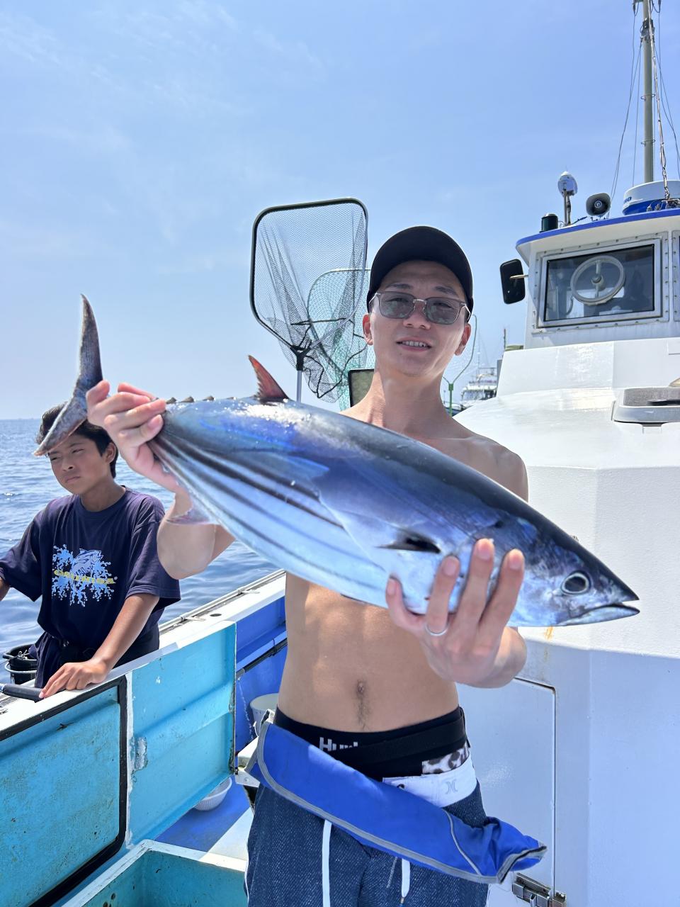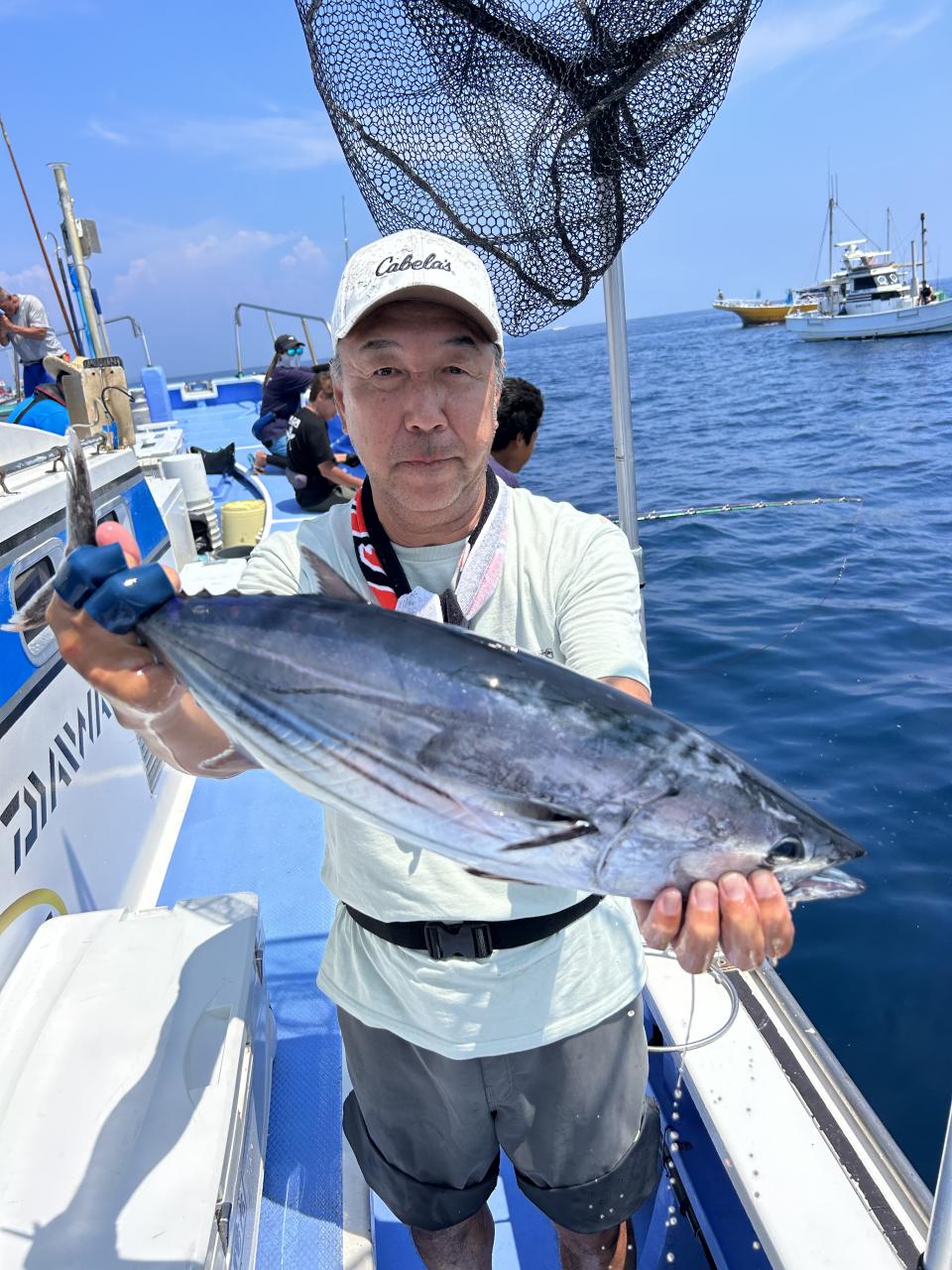 ナブラが沈んで解散してからはしばらく沖の方に走って先輩船長の紹介もあり現場到着してから早々にナブラ遭遇〜!かわされながらもカツオの顔見れたかと思えばジギングにメガヒット!70mランから丁寧なやりとりの末今季初18.9㎏キハダゲット成功!おめでとうございます!