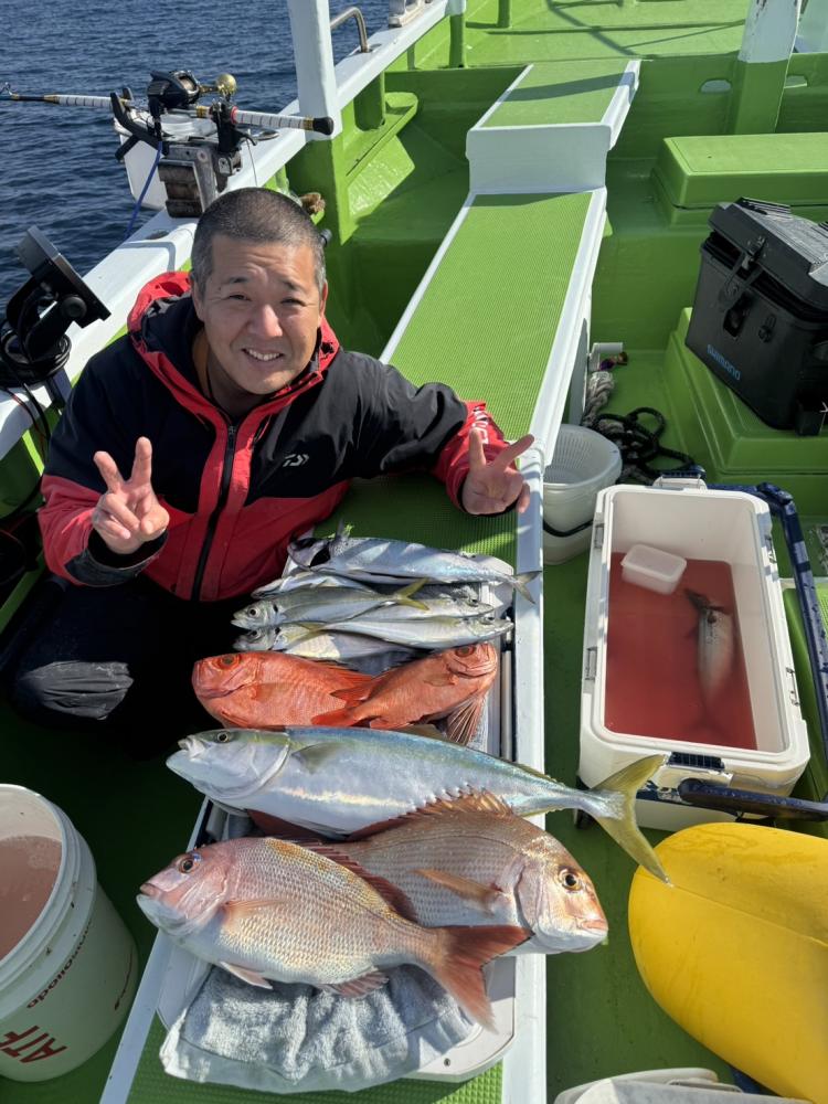 移動した先で早々にマダイの顔をみれてそこ周辺を攻めていきマダイ追加からキントキやサバを追加!